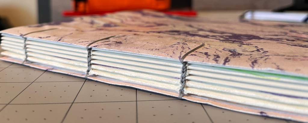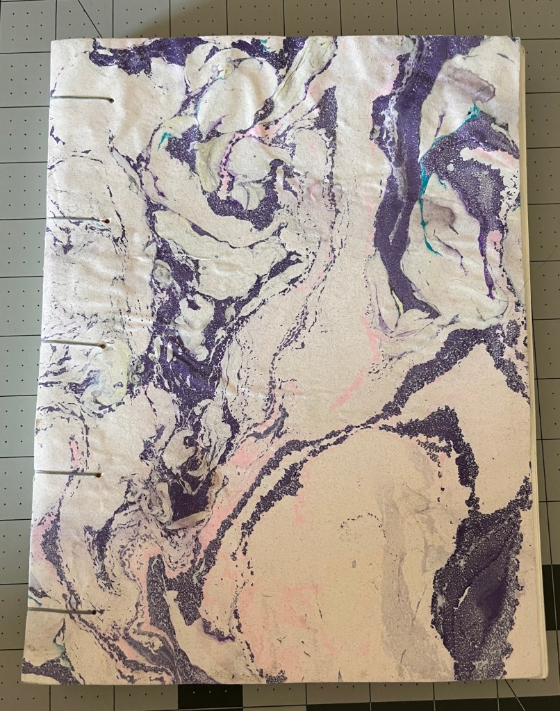 For my current personal projects, I finished making a new sketchbook earlier this week. I realized after making my smaller sketchbook that I would need a larger one for my illustration work. I opted to sew a coptic binding on this one because I knew that I would need more pages. It’s not the prettiest binding but I think it looks pretty good for my first time. I also used up some of the paper that I marbled for the cover. Out of all of the books that I have made so far, this one is my favorite. It’s so pretty!