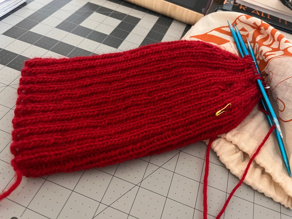 I am also working on a new beanie for myself. The one that I am currently wearing is one that I knitted using the pattern out of the book that taught me how to knit when I was a teenager. The hat is super cute and made from some really pretty wool yarn that I bought at the renaissance faire, but it is not very warm. So I am now working on a basic, ribbed fisherman’s style beanie. For this hat, I am using a more rustic, woolen spun yarn from the Brown Sheep Company. It is a wool/mohair blend in a bright red, very Jacques Cousteau, I love it!